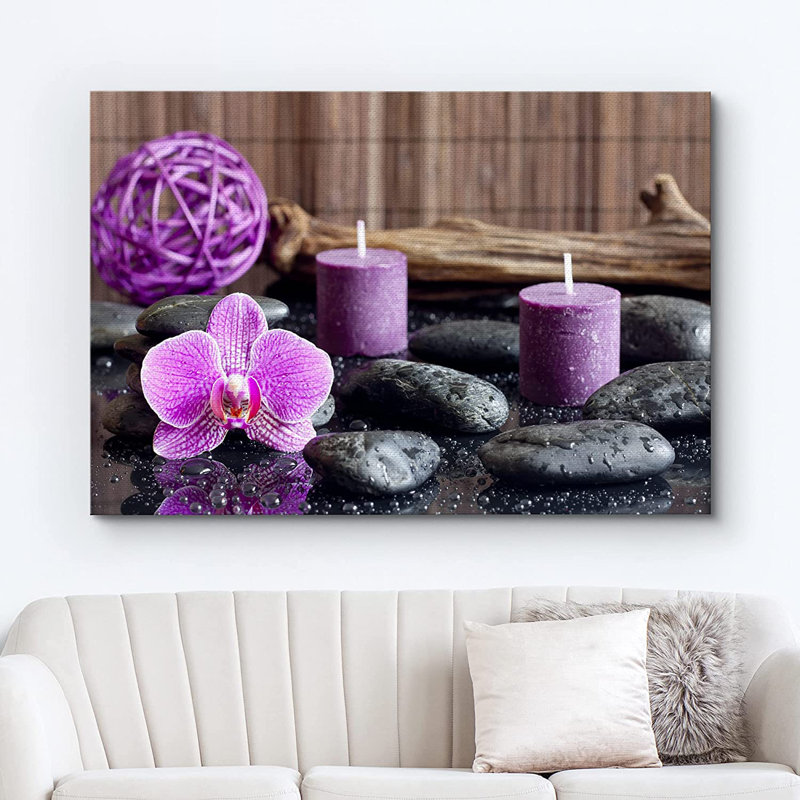 Zen Stones Bright Purple Orchid Calming Candles Bathroom & Laundry Décor On Canvas Print Wall Art